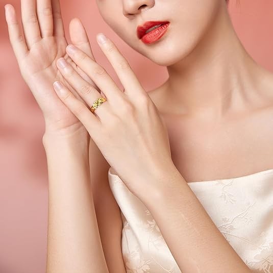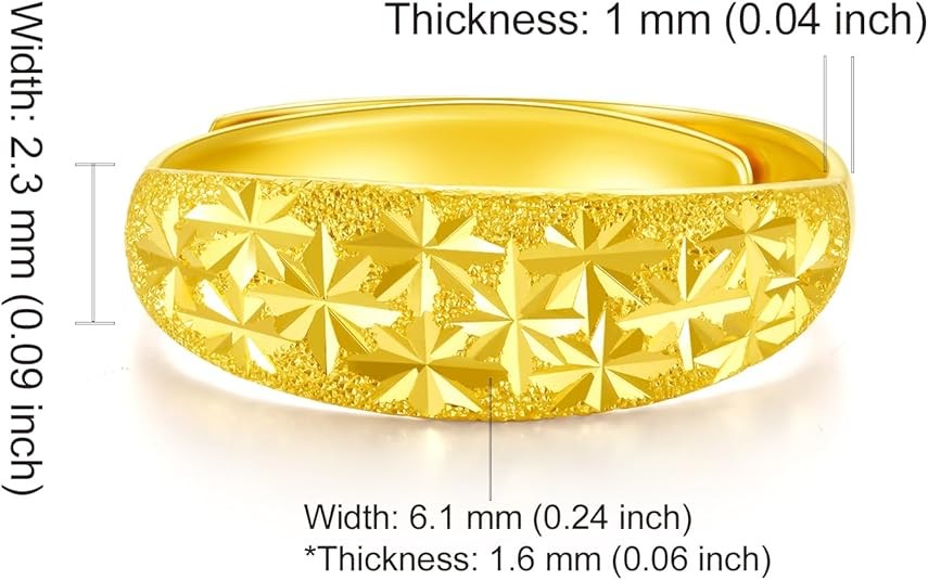• 24K Gold Ring: Crafted from the highest quality 24K gold, Ring Gold weight: 3.5 - 6 g(0.123 - 0.212 oz); 24K gold is the purest form of gold, making it highly valuable and desirable. As a precious metal, gold holds its value over time. The purity of the gold ensures that the ring will maintain its value and a durable use experience.