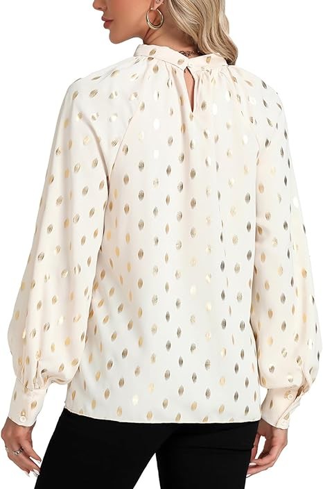 • Features: Polka dots, twist neck, long sleeve, raglan sleeve, button back, loose fit, casual blouse top.
