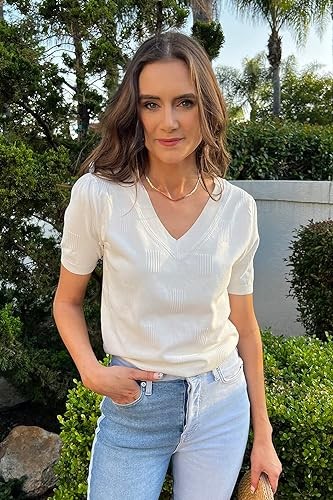 Features: Puff sleeve, short sleeve, v neck, solid color, special ribbed block pattern, relaxed fit. Shirts for women are the latest summer fashion in 2023
