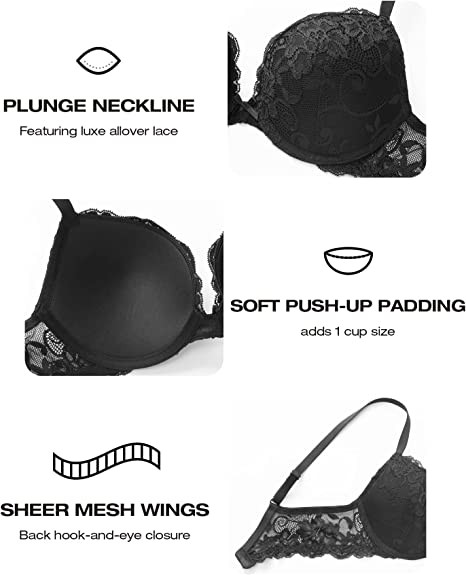 Deyllo Women’s Push Up Lace Bra Comfort Padded Underwire Bra Lift Up Add One Cup