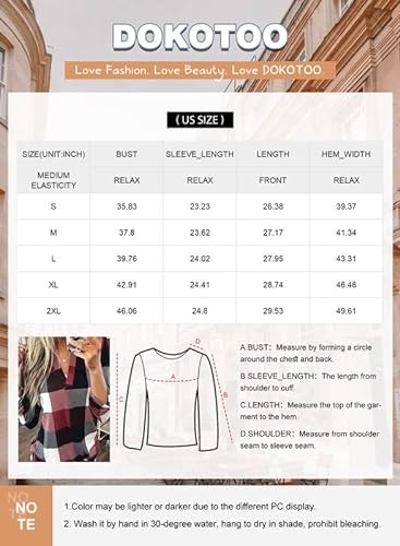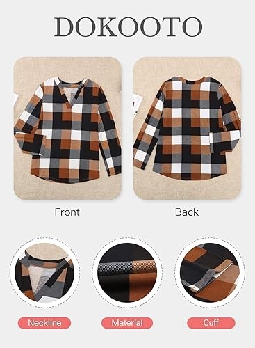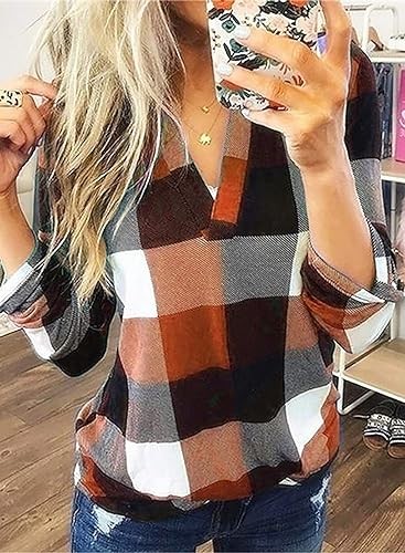 Dokotoo Womens Basic Casual V Neck Plaid Print Cotton Cuffed Long Sleeve Work Tops Blouses Shirts S-5XL