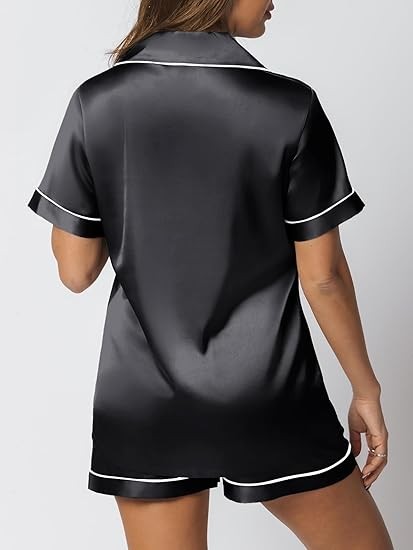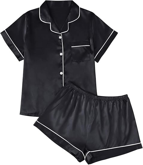 Pajama Top: Short sleeve sleepwear with notch collar,button front pajamas shirt and one chest pocket design.Lightweight and Skin-friendly silk pajamas for women.Great for sleeping,casual wear or lounging around the house or yard all day.
