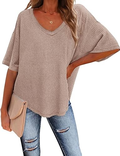 MEROKEETY Women's V Neck Batwing Half Sleeve Shirts Waffle Knit Loose Blouse Solid Color Tops