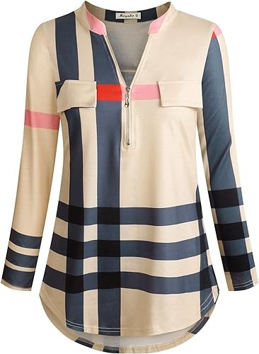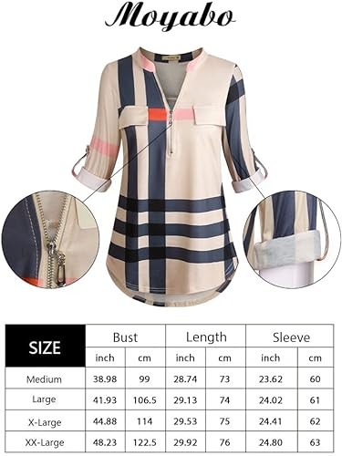 ✿ Design: Plaid casual shirts for women features with 3/4 cuffed sleeve,half zip v neck,patch chest pockets and perfect length to wear with any pants, jeans, leggings and skirts.
