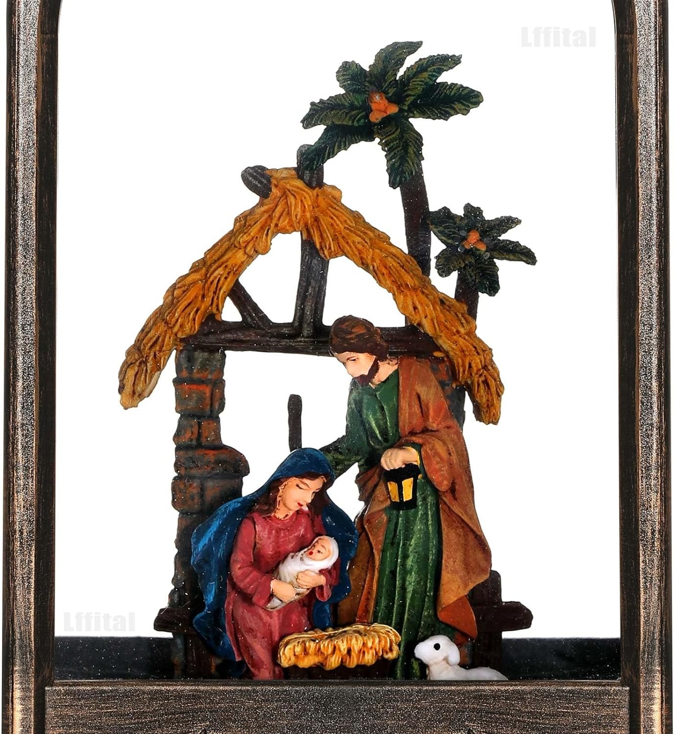 • Landscape of the snow globe: A built-in landscape that depicts the family of Jesus during the moment of his birth. The scene shows his parents holding the baby, with a sheep beside them, and the stable building in the background. The overall atmosphere of the scene is solemn and warm.