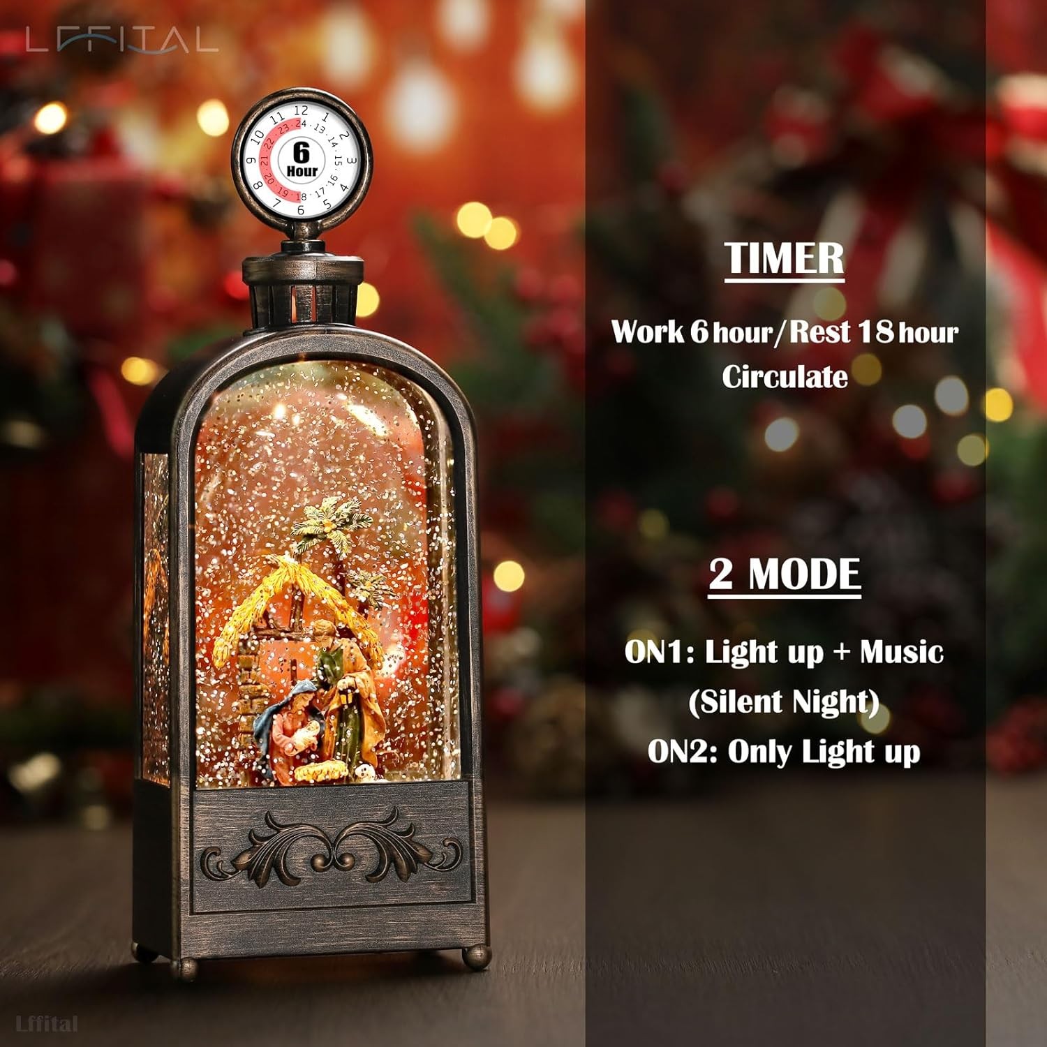 • Hour timer & music feature: The timer runs for 6 hours and then shuts off. It will automatically ignite at the same time the next day. You can turn the music on or off as you like. Use it for festive celebrations or turn it off for a peaceful atmosphere with sparkling snowflakes.