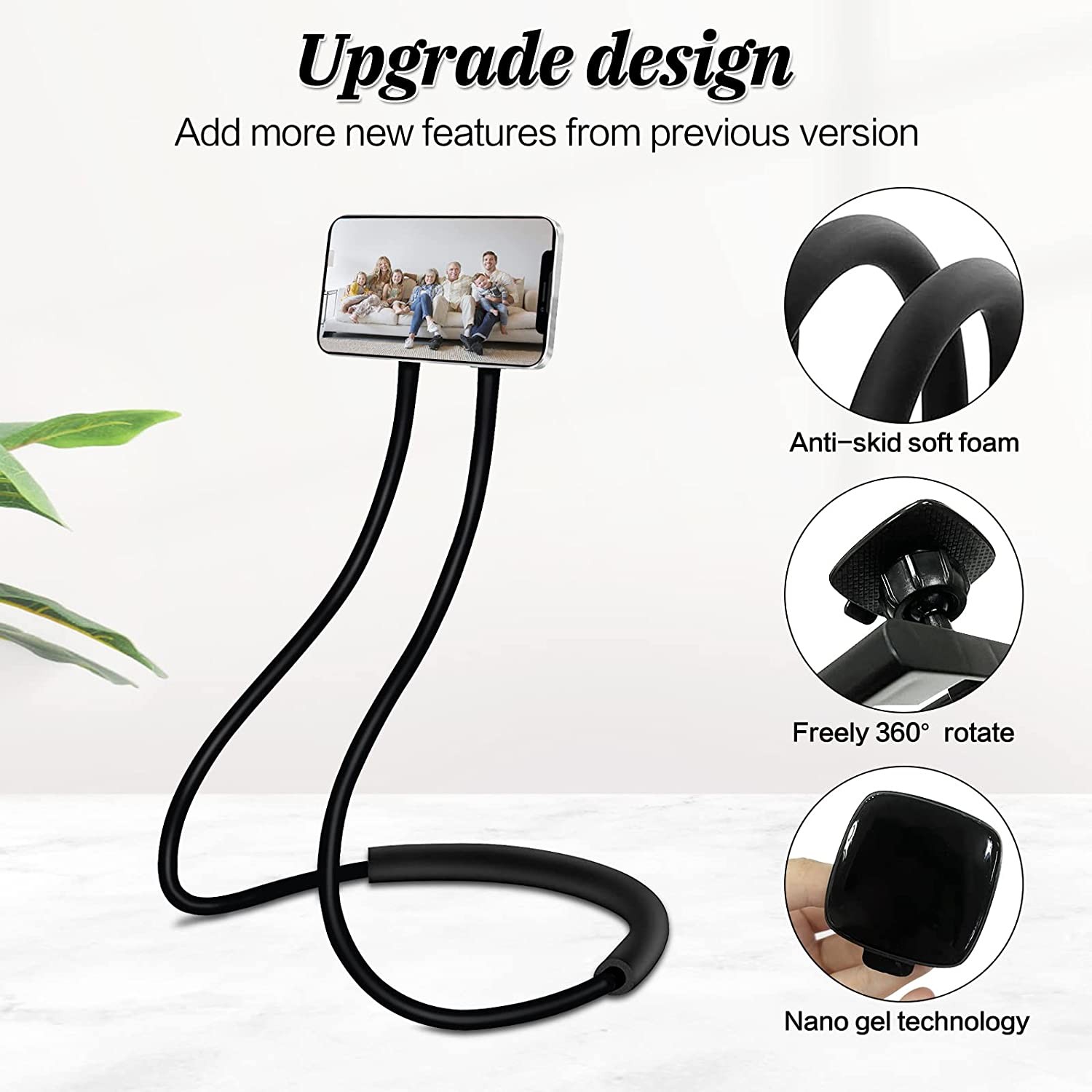 【EASY TO USE】Apply the newest nano gel technology, not as complex as the previous common clip design, just tear off the protective film and stick the phone on it. You can complete the installation less than 3 seconds, then you can enjoy it and use this phone neck holder everywhere. And it is removable and traceless, no damage to your phone. Also you can get a bonus: a replaceable collet